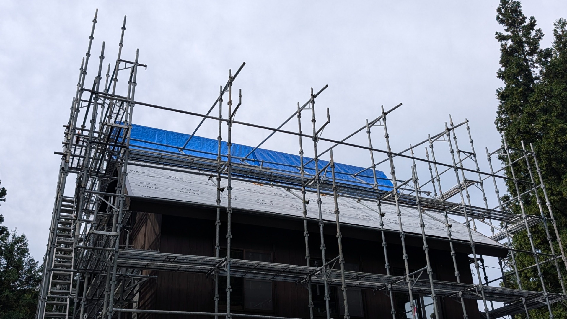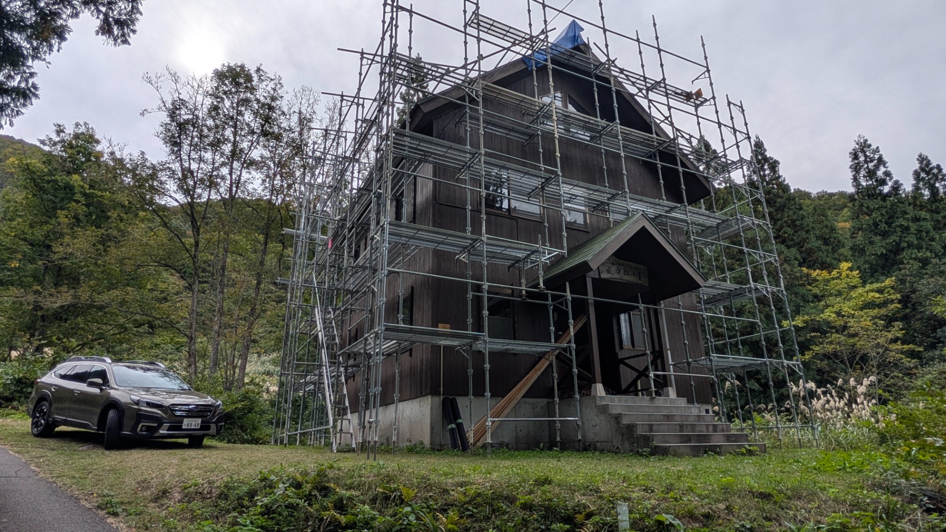 2000年竣工の山小屋ですが、山小屋竣工後数年で現役部員が雪山をやめてしまって、昔のワンゲルとはずいぶんと活動内容が変わり、利用頻度がガクッと落ちてしまったこともあり、大規模修繕を先送りにしてきました。ちょっと引っ張りすぎたなと反省をしておりますが、それをカバーするお仕事をしてもらいました。梅雨明けのころには足場がばれます。